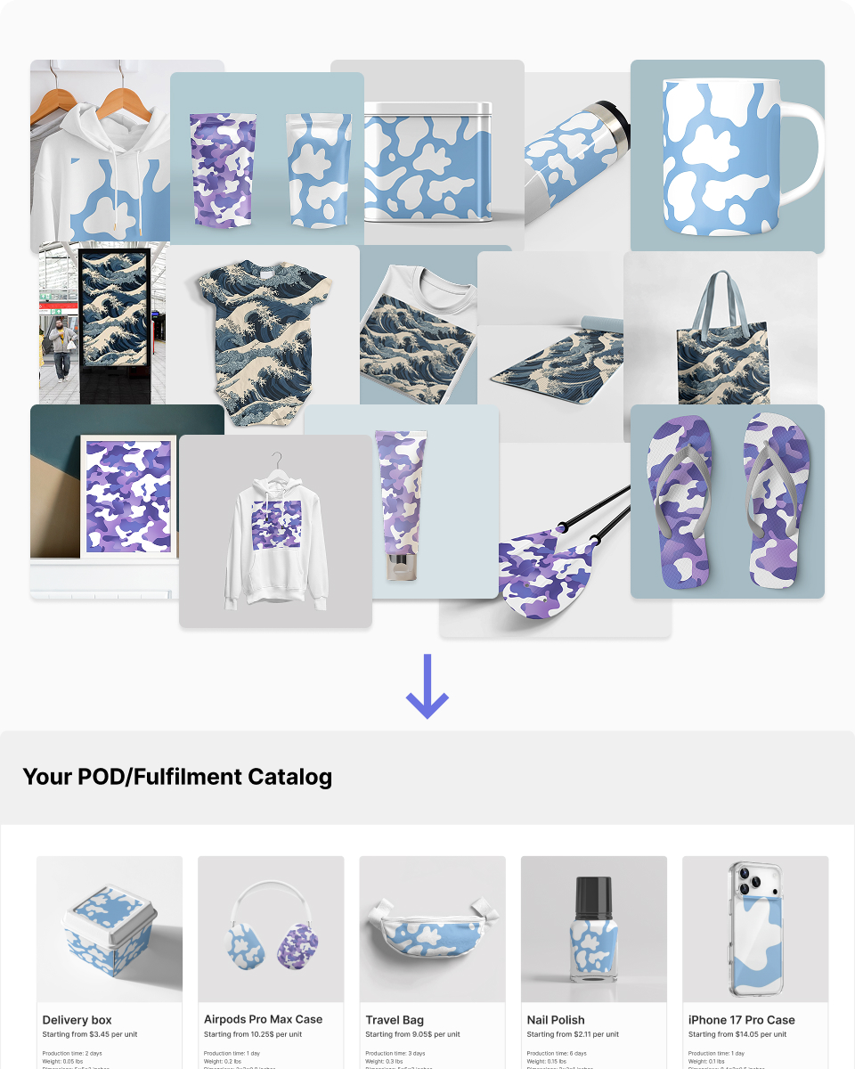 Design product variations with ease and pull them to your catalog via our API
